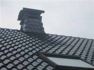 Dacheindeckung mit Hohlfalzziegeln marieneblau glasiert, Kaminverkleidung aus Bieberschwanzziegeln