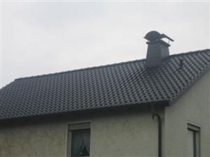 Dachziegel in Edelengobe, Dachrinne Kupfer, Fallrohr mit Schwanenhals, Kamin mit Schiefer verkleidet